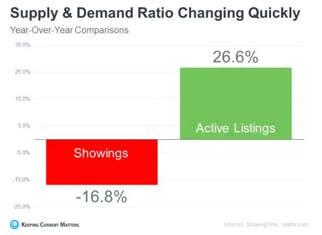 The reality is we’re seeing an inflection point in housing supply and demand. According to realtor.com, active listings have increased more than 26% over last year, while showings from the latest ShowingTime Showing Index have decreased almost 17% from last year (see graph below). This is an inflection point for housing because, over the past two years, we’ve seen a massive amount of demand (showings) and not enough homes available for sale for the number of people that wanted to buy. That caused the market frenzy.