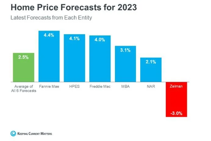 Right now, most experts are forecasting home price appreciation in 2023, but at a much slower pace than the last two years. The average of the six forecasters below is for national home prices to appreciate by 2.5% in the coming year. Only one of the six is calling for home price depreciation.