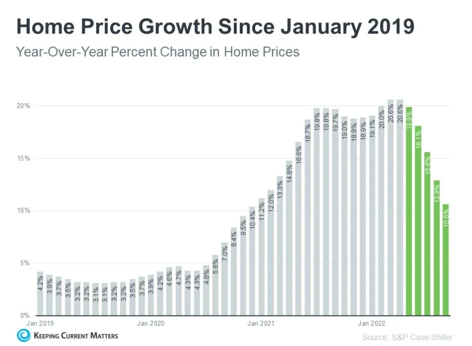 While home prices are down slightly month-over-month in some markets, it’s also true that home values are up nationally on a year-over-year basis. The graph below uses the latest data from S&P Case-Shiller to help tell the story of what’s actually happening in the housing market today: